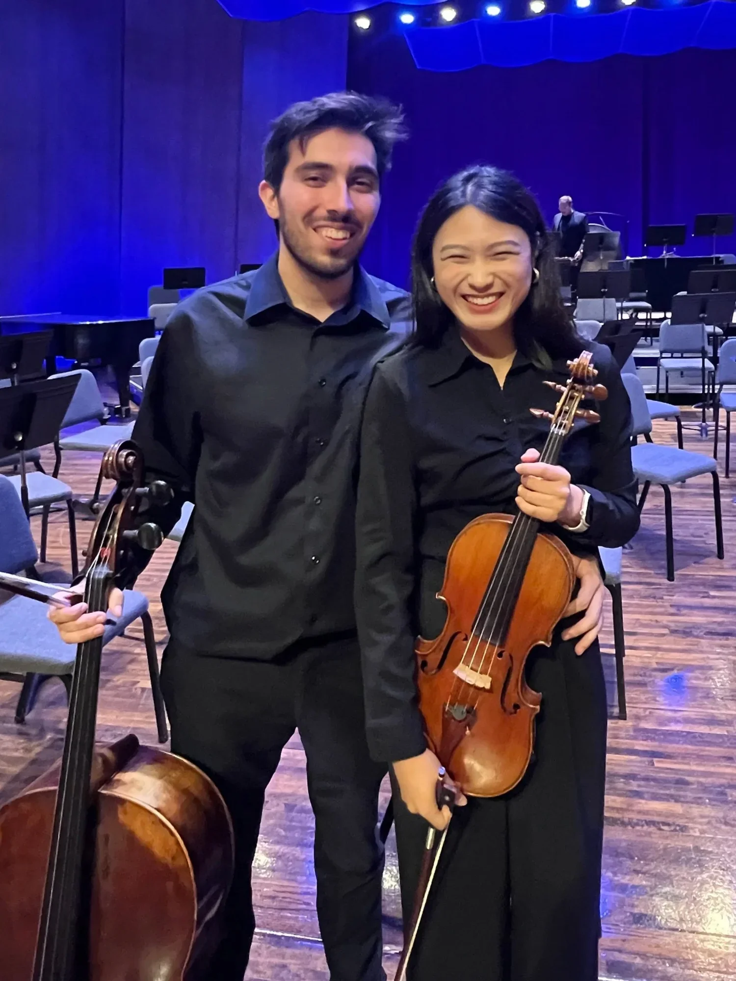 A man and woman in black clothing, smiling, standing on a stage with musical instruments, including a viola, in a concert hall with blue lighting and empty chairs and music stands in the background.